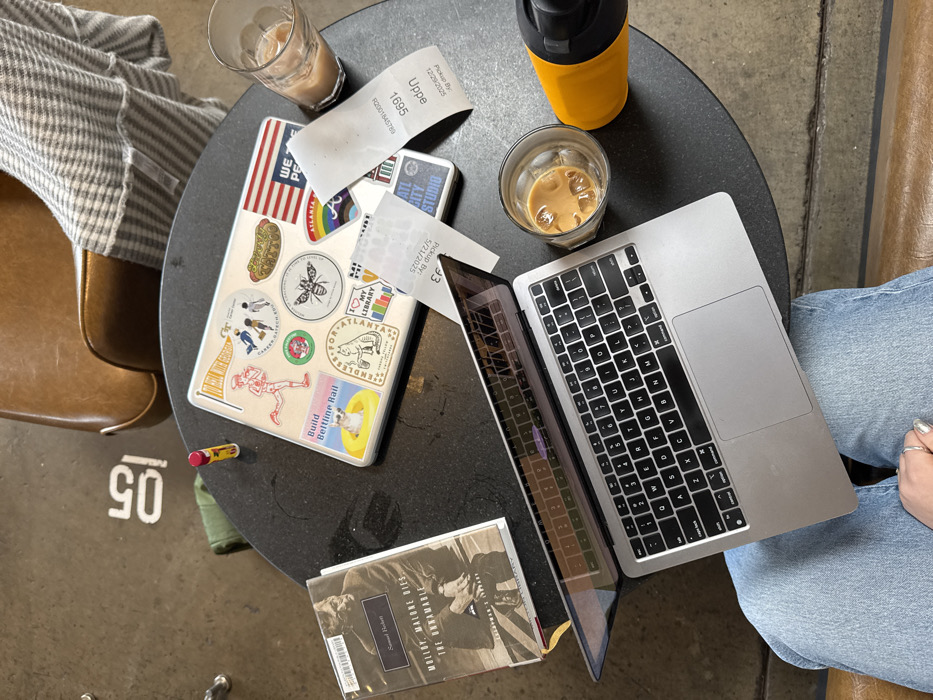 An overhead shot reveals a table with a laptop, a sticker-covered iPad, and a paperback book. A glass of iced coffee and a yellow water bottle sit nearby. Receipts are scattered over the iPad. The book's cover features a black and white portrait. The iPad is adorned with various stickers, including an American flag, a bee, and Atlanta-themed designs. A tube of lip balm lies next to the iPad. The table sits next to a chair and a person wearing jeans. A number "05" is on the floor.