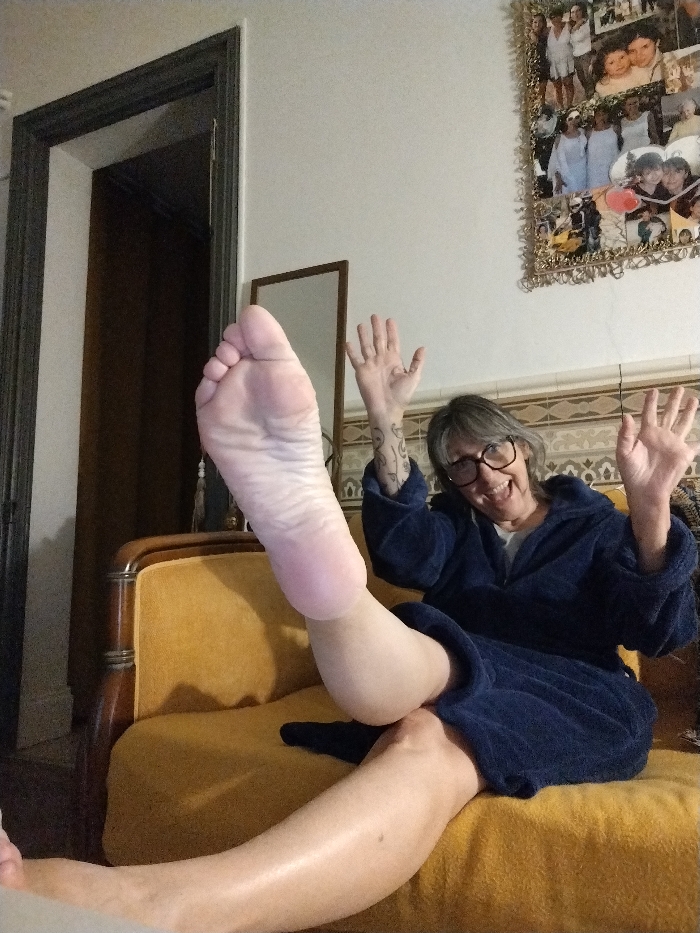 A woman wearing glasses and a blue robe sits on a yellow couch, both hands raised in the air. Her left leg is extended, showcasing the sole of her foot. A mirror stands behind her, next to a doorway. A framed photo collage hangs on the wall. A small, ornate table is also visible. The woman is smiling.
