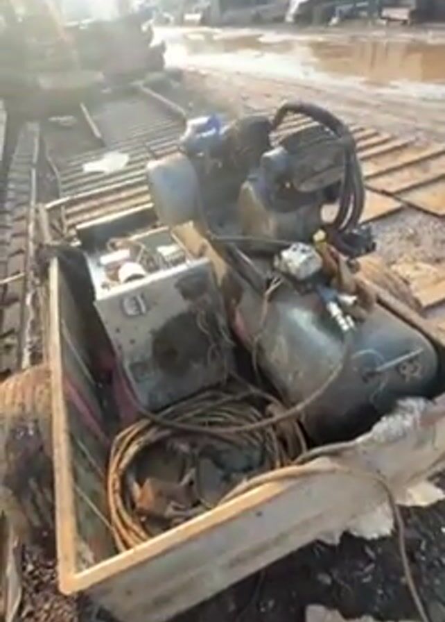 The video begins with a low-angle shot of an air compressor and other equipment loaded in a damaged container or tray