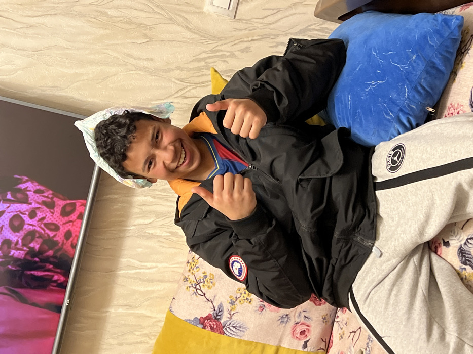 A smiling boy in a black jacket, orange undershirt, and gray sweatpants is giving two thumbs up