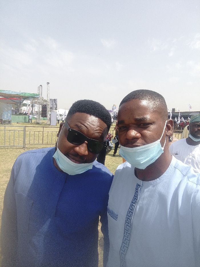 The image depicts an outdoor public event under a hazy, light blue sky with sparse clouds. In the immediate foreground, two adult males of dark complexion are positioned, appearing to be taking a photograph together. The man on the left wears a blue traditional long-sleeved garment and black sunglasses, with a light blue surgical mask pulled down below his chin. His hair is styled in a short, dark fade. The man on the right wears a light blue traditional long-sleeved garment featuring a darker blue geometric pattern embroidered vertically on the front. He wears a light blue surgical mask covering his nose and mouth, and has a short, dark buzz cut. Both men face the camera directly. Behind them, a metallic fence or barrier separates the foreground from a larger event area. Beyond this barrier, a grassy field is visible, populated by scattered individuals and small groups. To the left, a large stage structure with a green canopy and metal scaffolding is erected, flanked by tall truss towers supporting what appear to be speakers or lighting equipment. Further into the background on the right, white tents and various flags or banners are visible. The scene suggests a daytime gathering, possibly a rally or festival. The image itself provides no specific visual cues or landmarks to definitively identify the exact location within Jos, Nigeria.