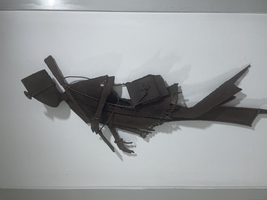 A wall-mounted, two-dimensional metal sculpture of a stylized human figure is depicted against a plain white wall in Falomo, Nigeria