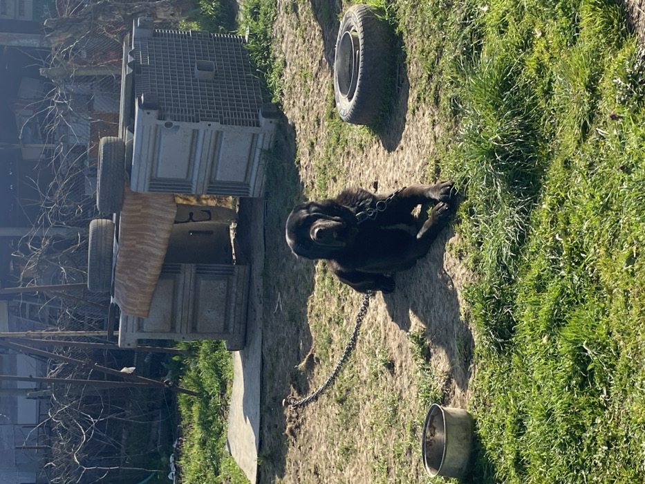 The image displays an outdoor scene in Simeonovgrad, Bulgaria, under direct sunlight. A large, dark-furred dog, appearing to be a Newfoundland or similar breed, lies in a prone position on a patch of sparse grass and dirt, facing slightly towards the viewer. A heavy metal chain is attached to a metal collar around its neck, extending off-frame to the left where it is anchored into the ground. To the dog's immediate left, a single empty, tarnished metal bowl rests on the ground. To its right, a single car tire lies flat. In the background, behind the dog, a makeshift shelter is visible, constructed from two large, grey, industrial-style plastic or composite crates forming an enclosure. A patterned fabric or carpet is draped over the top of this structure, serving as a roof, with two additional car tires placed on top of it. The area surrounding the shelter and extending into the background consists of dry, uneven ground with patches of grass and several bare, thorny bushes or small trees, indicating a rustic or semi-rural environment. No human figures are present.