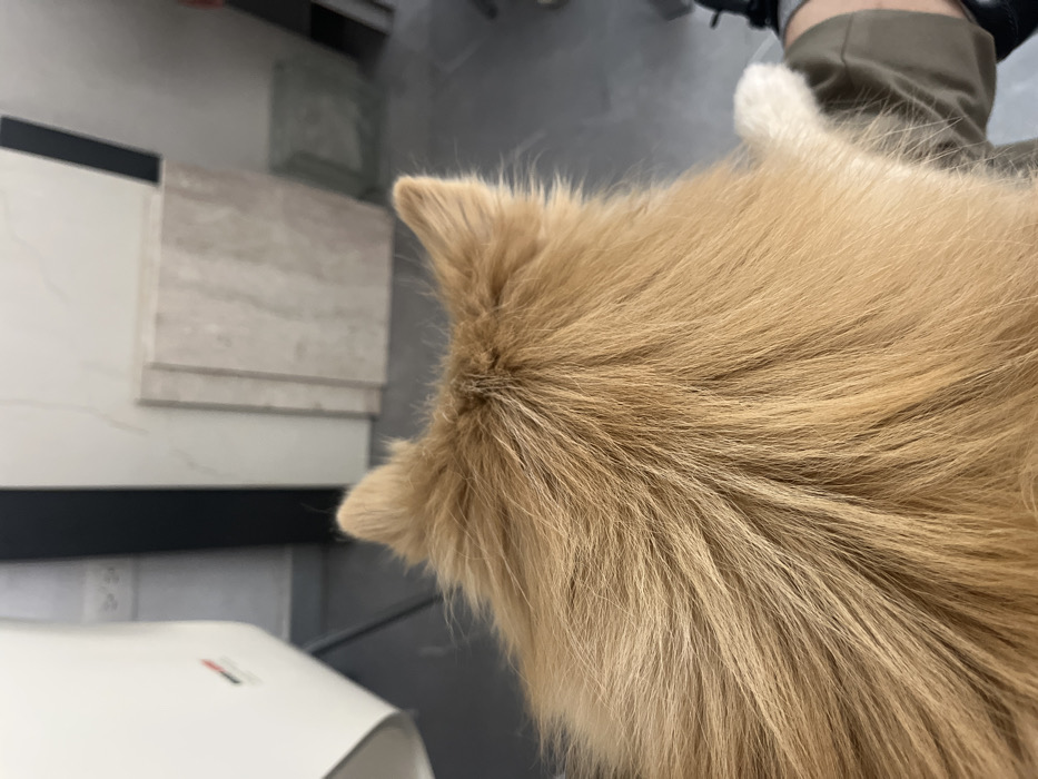 The image presents a close-up, dorsal view of a domestic animal, likely a long-haired dog, distinguished by its light brown to ginger fur and pointed ears. The animal is positioned with its back towards the viewer, seemingly sitting or resting on a person's lap, evidenced by the khaki-colored fabric (clothing) and a dark, possibly black, object (footwear) partially visible near a white paw on the lower right. The background reveals an indoor setting with a dark grey floor. To the immediate left, a portion of a white, angular object, resembling a modern chair or a display fixture, features a red and black logo or text. A dark, vertical rectangular element stands in the mid-ground, partially obscuring the background. To the right, several large, rectangular slabs, appearing to be light-colored ceramic tiles or stone samples with subtle veining patterns, are propped against a light-toned wall. A translucent sheet, possibly glass or acrylic, also leans against the wall near the tiles. The environment suggests an interior space, potentially a residence, an office, or more likely, a showroom for building materials such as tiles and stone. There are no specific architectural features, landmarks, or identifying signs within the image that allow for the precise determination of its location within the city of Cancún, Mexico.