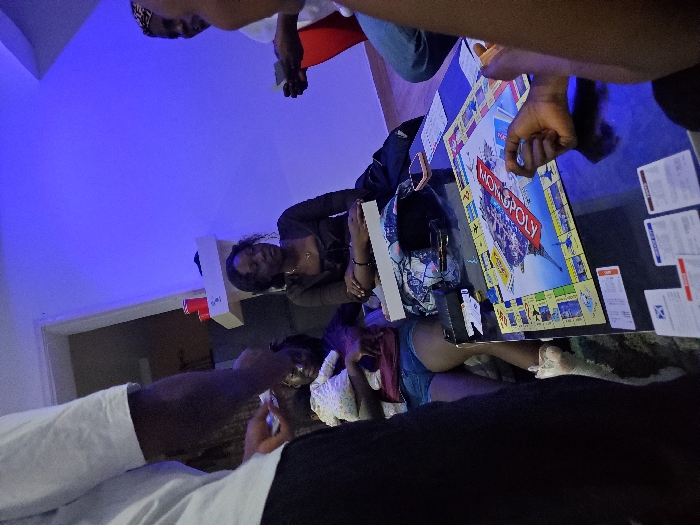 A group of people are playing Monopoly around a low, dark table. One person wears a headscarf, while another wears a black top. The game board is visible, with various Monopoly properties and cards scattered around it. There's a stand with red cups visible in the background. The room appears to be dimly lit with a blue hue.
