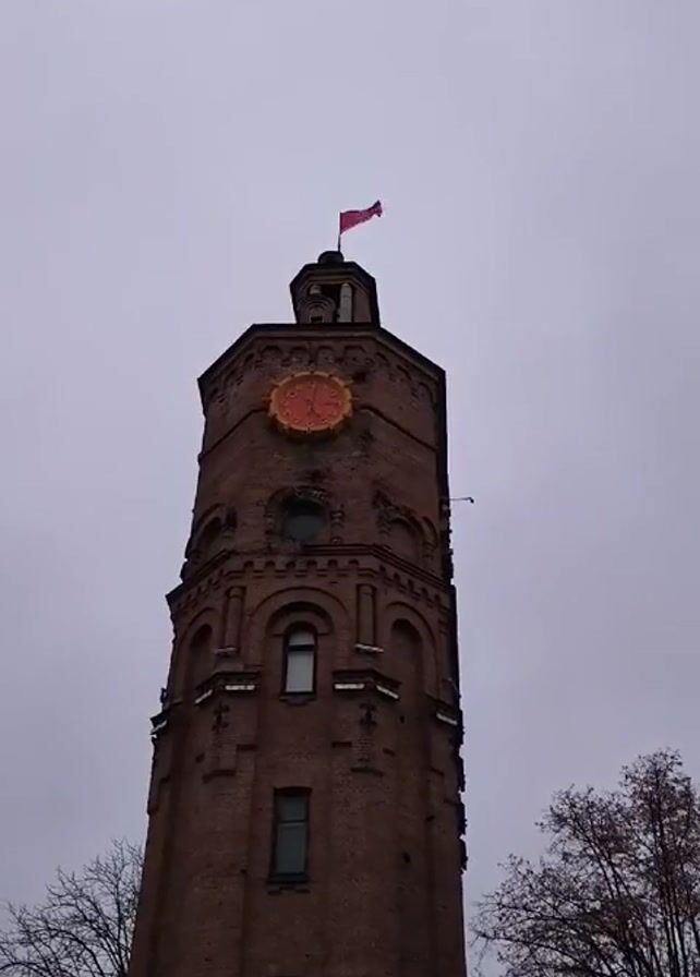 tall brick tower against a grey sky. A clock is visible on the tower near the top. A small red flag is flying atop the tower. Bare trees are visible on either side of the tower. The tower has several arched windows. Church bells are ringing.