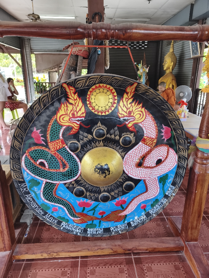large, decorated gong suspended on a wooden frame. Two stylized dragons adorn the gong's face, facing each other. Below the dragons, are lotus flowers painted in bright colors. A golden circular area sits in the center of the gong. At the bottom of the gong, there is writing, including "MR Alexander Marx" and Thai characters. In the background, one can see a Buddha statue and people. The setting appears to be a temple or religious site.