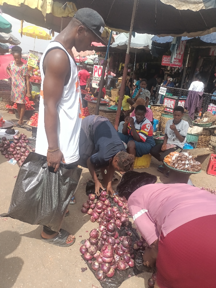 A bustling outdoor market scene features multiple people. A man in a white tank top and baseball cap holds a black plastic bag, standing near a pile of red onions. Two women bend over the onions, seemingly sorting or selecting them. Other people are seated nearby amidst baskets and trays of goods. A woman in a patterned dress stands behind tomatoes, adding to the vibrant atmosphere. Umbrellas provide shade, suggesting a sunny day. The scene conveys a sense of activity and commerce.