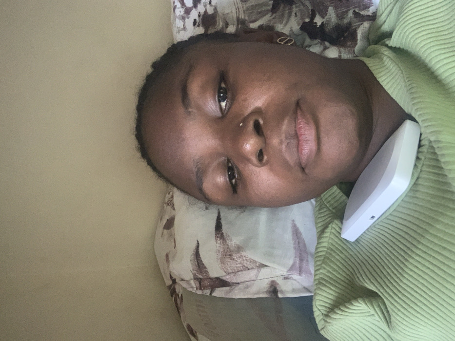 The image depicts an indoor scene in Tempure, Nigeria. A dark-complexioned female individual is seen from the upper chest upward, lying down or reclining, looking directly at the camera with a neutral expression. She wears a light green, ribbed long-sleeved shirt. A small stud nose piercing is visible in her left nostril, and a small gold-colored oval earring is present in her left ear. A white, rectangular device with rounded corners, a small indicator light, and a slot on its left side rests on her upper chest, partially tucked into the neckline of her shirt. Behind her head, a light-colored pillow with a faint brown, leafy pattern is visible, set against a plain light beige wall.