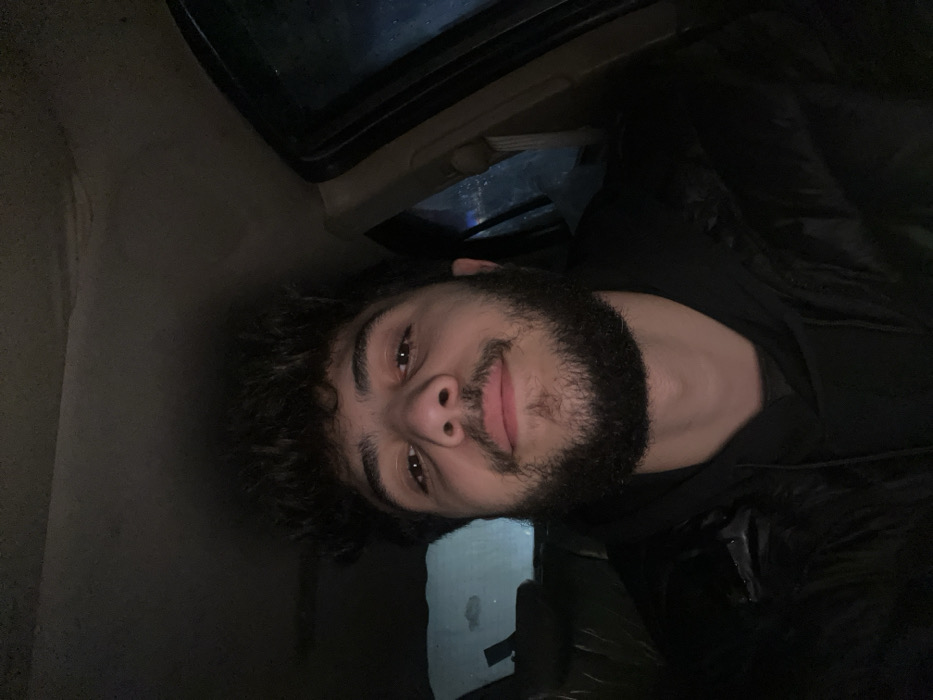 A man with dark, curly hair and a full beard is pictured at an angle. He has dark eyes and a slight smile. The lighting is dim, and the background appears to be inside a car or vehicle. A portion of the car's interior, including the ceiling and possibly a window, is visible in the background. The man is wearing a dark-colored shirt or jacket.