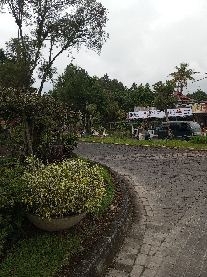 A curving stone pathway leads through a lush landscape. A large potted plant sits near the road's edge. Buildings with signs are visible in the background, along with parked cars and people. Trees of varying sizes dot the scene, including a tall palm tree. Overcast sky.