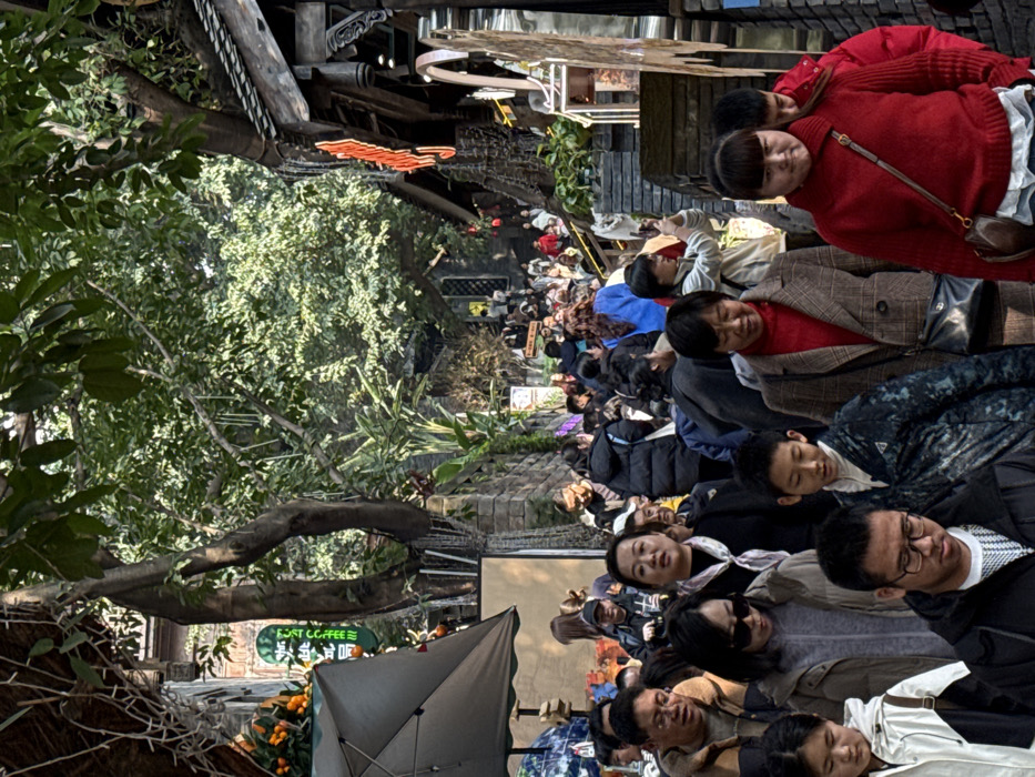 A densely packed crowd fills a narrow outdoor street, lined with buildings and trees. The people are diverse in age and attire, with many wearing winter coats and hats. Some individuals are looking at the camera, while others seem focused on their surroundings or engaged in conversation. The scene appears bustling with activity, with shops and signage visible in the background, adding to the lively atmosphere.