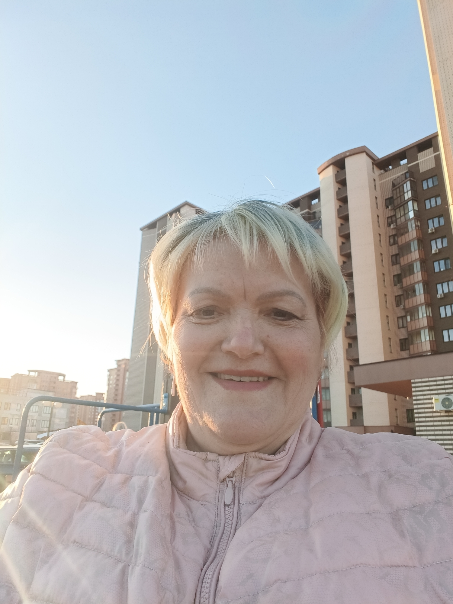 The image depicts a selfie of a smiling, fair-skinned middle-aged to elderly female with short, light blonde hair and visible earrings. She is wearing a light pink, quilted jacket with a textured pattern and a zippered front. Direct sunlight from the left illuminates her face and hair, indicating a low sun angle. The background reveals an urban environment in Odintsovo, Russia, characterized by multiple multi-story residential buildings under a clear, light blue sky. A prominent building to the right features sections of dark brown/grey and light beige/cream, multiple windows, balconies, and a tall, narrow vertical structure on its right edge. Another building, centrally located, exhibits rounded architectural features and a lighter color palette. Further in the distance, additional buildings are visible, bathed in a warm, golden light. A metal railing is present in the mid-ground, partially visible behind the subject.