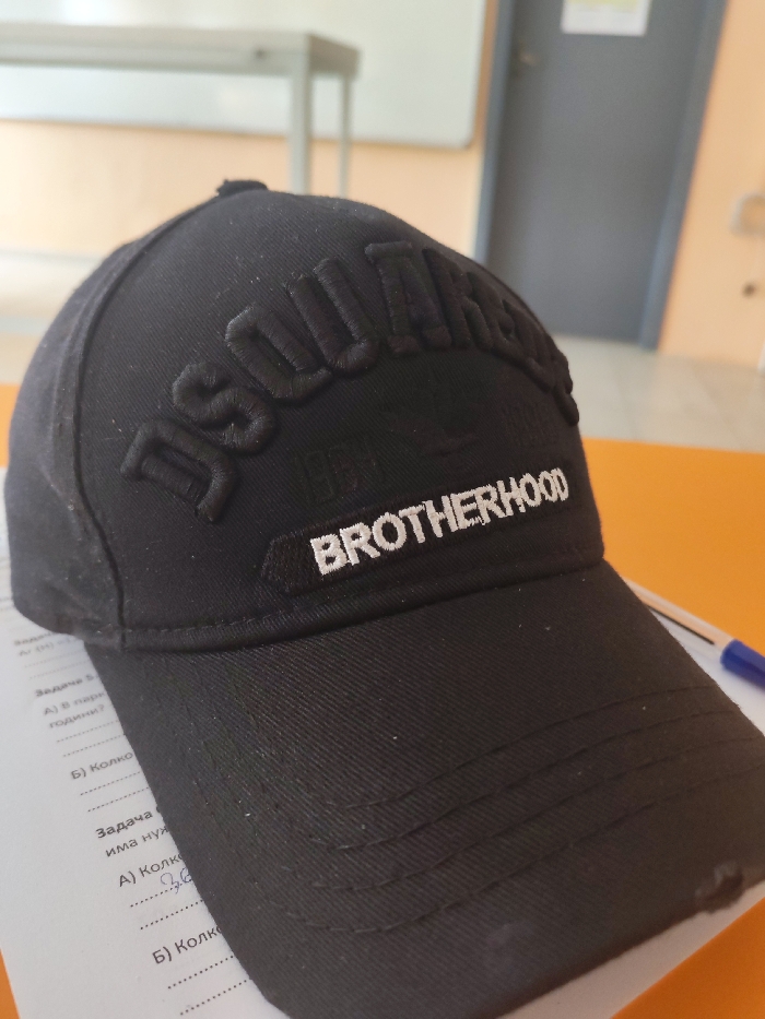 A close-up, high-angle shot depicts a black baseball cap resting on a white paper document on an orange tabletop within a classroom in Beloslav, Bulgaria. The cap, positioned centrally, displays raised black "DSQUARED2" lettering across its crown, with a white embroidered patch beneath it stating "BROTHERHOOD" in white capital letters. The brim of the cap shows slight wear. The white paper underneath has visible Cyrillic text, including "Задача 5" (Problem 5), "година" (year), "А) Колко" (A) How much), and "Б) Колко" (B) How much), suggesting a test or worksheet. A handwritten number "36" is visible next to "А) Колко". A blue ballpoint pen is partially visible to the right of the cap, resting on the paper or table. The background features light orange walls, a light-colored metal-framed table or stand, and a closed gray door with a light handle. No individuals are present in the frame.