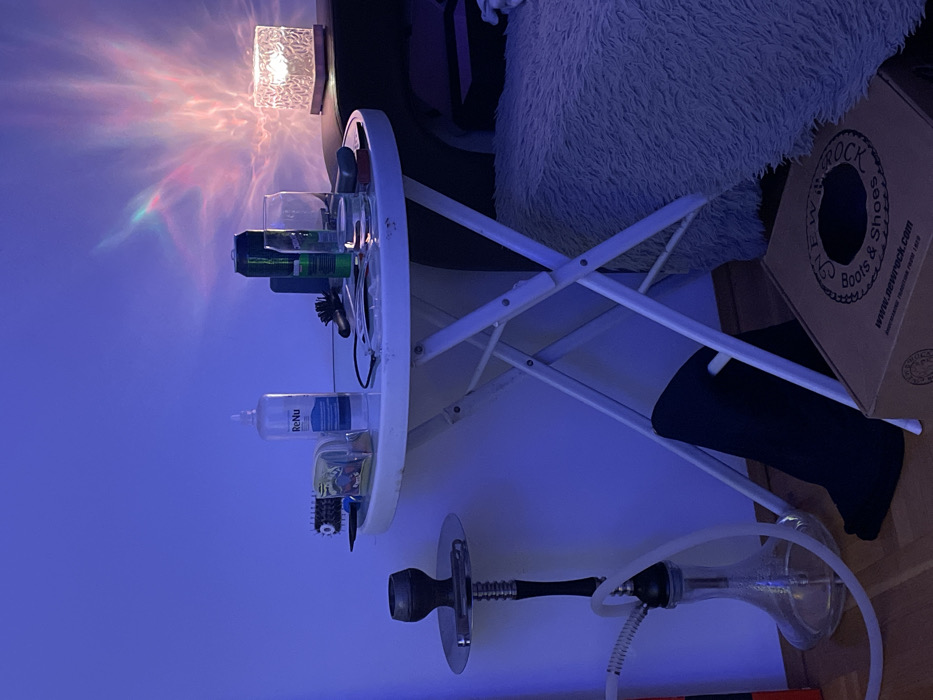 The scene depicts an interior residential space, likely a bedroom or living area, located in Budva, Montenegro. In the foreground, a white, round folding table stands on a wooden floor. The table's surface holds a bottle of ReNu contact lens solution, a hairbrush, a small transparent pouch, a green beverage can, an empty clear drinking glass, and various small assorted items. To the left of the table, a hookah with a clear glass base, a metallic and black stem, and a white hose rests on the floor. A dark item of clothing or fabric is draped over or leaning against a leg of the folding table. To the right of the table, a cardboard box labeled "New Rock Boots & Shoes" is visible on the floor. Behind the table and to the right, a bed or sofa covered with a fluffy, light-colored blanket is partially visible. A decorative lamp or light source on a surface behind the table projects multicolored, patterned light onto the adjacent white wall, while the room is generally illuminated with a blue ambient light. No individuals are present in the image.