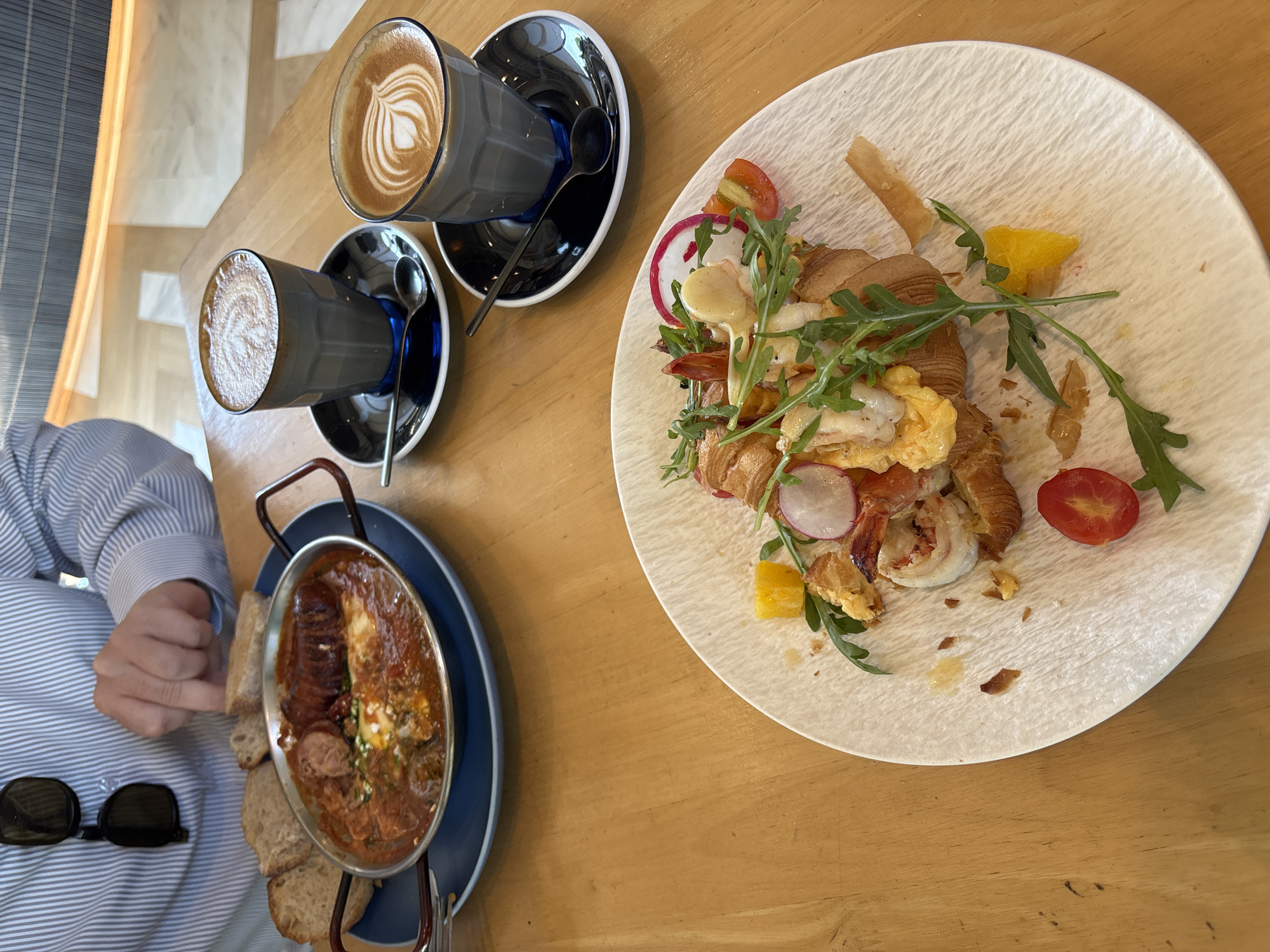 The image depicts a table setting at a dining establishment, likely in Choeng Thale, Thailand, based on available information. Two cups of latte with visible latte art sit on black saucers. Beside them is a white plate with what appears to be a croissant topped with shrimp, eggs, radishes, tomatoes, and arugula. To the left is a dish in a pan, filled with a tomato-based stew containing sausage. Bread is served with the stew. A person's arm, wearing a striped shirt, is visible next to the stew. Sunglasses are placed on the table nearby. The table is made of wood.