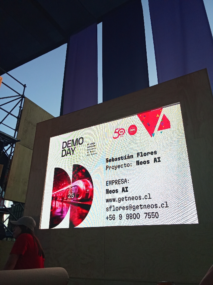 A sign announces "Demo Day," featuring a graphic of a halved circle with a train inside, marked "20250". It lists Sebastián Flores and his project "Neos AI". The company is also "Neos AI", with the website "www.getneos.cl" and email "sflores@getneos.cl". A phone number "+56 9 9800 7550" is listed. A woman in a red shirt stands below the sign, partially visible.
