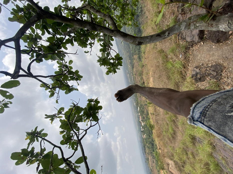 The image depicts a high-angle view from an elevated position in Nguzu Edda, Nigeria, overlooking a vast, hilly landscape under a partially cloudy sky. In the foreground, extending from the bottom-left towards the upper-middle, a single dark-skinned human leg is visible, clad in blue denim shorts with frayed edges. The leg is bent at the knee, with the bare, dirty foot extended upwards. The foot's toes are slightly curled. Green tree branches with leaves frame the upper-left and upper-right corners of the image. A light-barked tree trunk is present on the right side. The immediate ground consists of dry, golden-brown grass and rocky patches, with a narrow dirt path visible in the lower-right quadrant. In the mid-ground and distant landscape, rolling hills covered in varying densities of dry grass and scattered green vegetation descend into valleys. Clusters of white and light-colored buildings with contrasting roofs, indicative of a settlement, are visible in the far distance against the horizon.