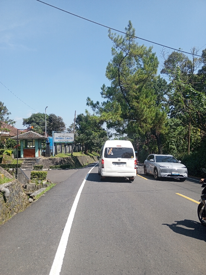 The image depicts an outdoor road scene in the city of Multhan, India, under a clear, cloudless blue sky. An asphalt road, marked with a solid white center line, extends into the foreground and curves slightly to the left in the midground. A white Toyota Hiace van, bearing license plate B 1555 VMW, is positioned centrally in the right lane, facing away from the viewer. A dark, triangular object is affixed to its rear window. To the right of the van, a silver or light grey SUV, with license plate D 2318 LNW, is visible in the opposing lane, facing towards the viewer. The front wheel and fender of a motorcycle are partially visible on the extreme right of the frame. On the left side of the road, a small building with a light blue roof and walls, resembling a guardhouse or booth, stands on a raised platform. Adjacent to this structure, a white sign mounted on two poles displays "BHIMA CAKTI" in blue lettering, with additional smaller, illegible text below. The road is flanked by stone retaining walls and well-maintained green bushes and hedges. Dense green foliage and numerous trees, including a tall pine tree, cover the landscape on both sides of the road. A single thin utility line stretches horizontally across the upper portion of the sky.
