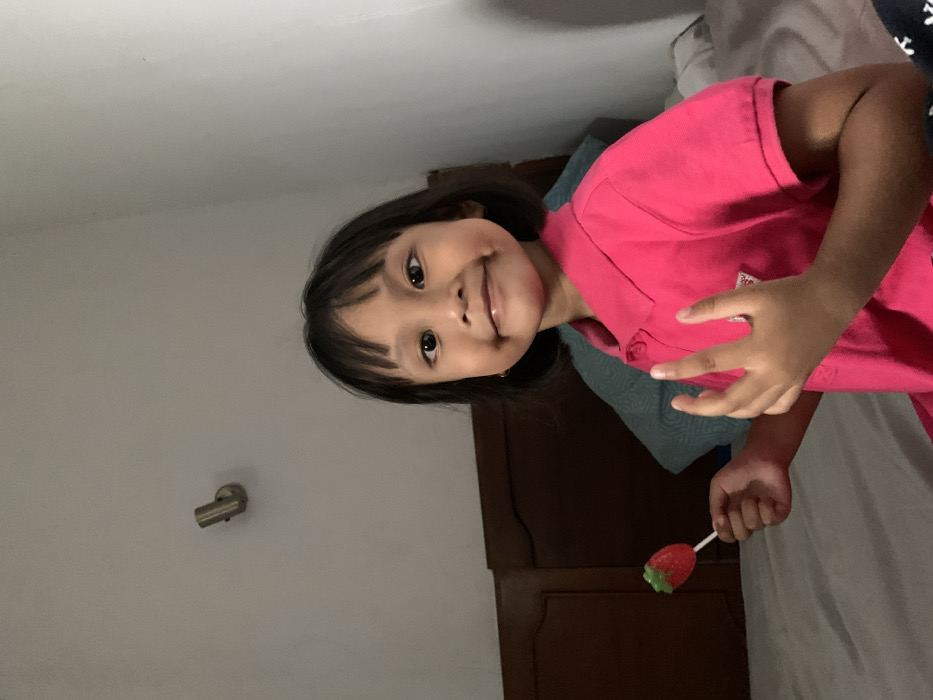A young girl with bangs and dark hair is wearing a bright pink short-sleeved shirt. She's smiling and holding up her hand in a peace sign. In her other hand, she holds a strawberry-shaped lollipop. The background includes a beige wall with a light fixture, a blue cushion, a dark wooden door or furniture piece, and a white bed.