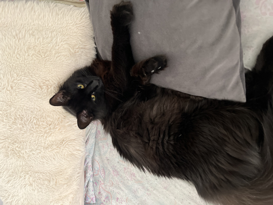 The image depicts an indoor scene, specifically a domestic interior. The primary subject is an adult long-haired black cat, oriented on its left side and looking directly towards the viewer with bright yellow eyes. Its fur is predominantly black, with a few white hairs visible, particularly on its paws. The cat's head rests partially on a smooth, grey pillow, while its right front paw extends across the same pillow. The cat's body occupies the lower left portion of the frame. Behind the cat's head and to the upper right is a large, fluffy, off-white cushion or pillow. The bedding beneath the cat consists of a light-colored sheet featuring subtle pink and light blue floral or paisley patterns. No other people, subjects, or interactions are visible. The image contains no visual information to identify a specific location within Ushuaia, Argentina.