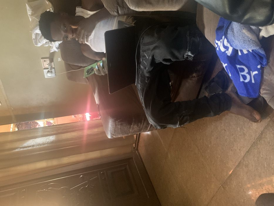 The scene is set indoors in a living space within Kabba, Nigeria. A young male individual is seated barefoot on a brown, worn upholstered couch, occupying the right side of the frame. He is dressed in a white sleeveless undershirt and dark, distressed jeans. A dark-colored laptop rests on his lap, while he holds a light green smartphone in his left hand. His right hand is positioned over his mouth or lower jaw area. Behind him, on a light-colored wall, two white electrical outlets are mounted, with a white cable plugged into one. A red-orange light source, possibly a candle or small lamp, is visible on a surface behind the couch, generating a prominent red lens flare. To the left, a dark, ornately carved wooden door is partially visible adjacent to a light-colored curtain, which is partly open, revealing a glimpse of an illuminated area beyond. The floor consists of light brown tiles. A blue and white patterned fabric object is partially present in the lower right foreground.
