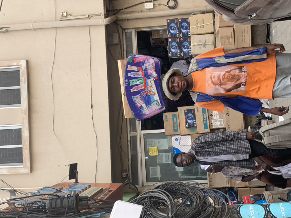 The scene depicts a bustling street in Ikeja, Nigeria, characterized by commercial activity and urban infrastructure. In the foreground, a male individual in his mid-adult years walks directly towards the viewer, balancing a large, colorful, blue-rimmed tray of assorted packaged goods (likely cosmetics or toiletries) on his head. He wears a light-colored woven bucket hat, an orange t-shirt with a graphic image of a person and the text "time less" printed below, a blue and white vest draped over his shoulders, and light-colored trousers. His gaze is directed forward. Behind him and slightly to the left, a young adult male with glasses, dressed in a plaid long-sleeved shirt over a white t-shirt and dark pants, walks carrying a light-colored backpack in his left hand and a white bag in his right hand. He is looking towards his left. Partially obscured by this individual, an older female with a light-colored head covering is seated on a low surface, holding a white bag. The background features the facade of a multi-story building. The upper floor has two windows fitted with horizontal security bars. The ground floor houses an establishment with a glass door and display window, through which numerous cardboard boxes are visible, stacked both inside and outside. Prominently visible brands on these boxes include "D-Link," "TP-Link," and "Motorola," with some showing images of circular electronic devices, possibly surveillance cameras. To the far left of the frame, a dense cluster of black electrical or communication cables is visible, coiled and bundled, attached to a utility pole or wall-mounted fixture. A partial blue circular sign is visible at the lower left. A light-colored drainpipe runs vertically along the right side of the building facade. The ground is paved, indicating a sidewalk or street. A section of a dark-colored vehicle is partially visible on the far right.