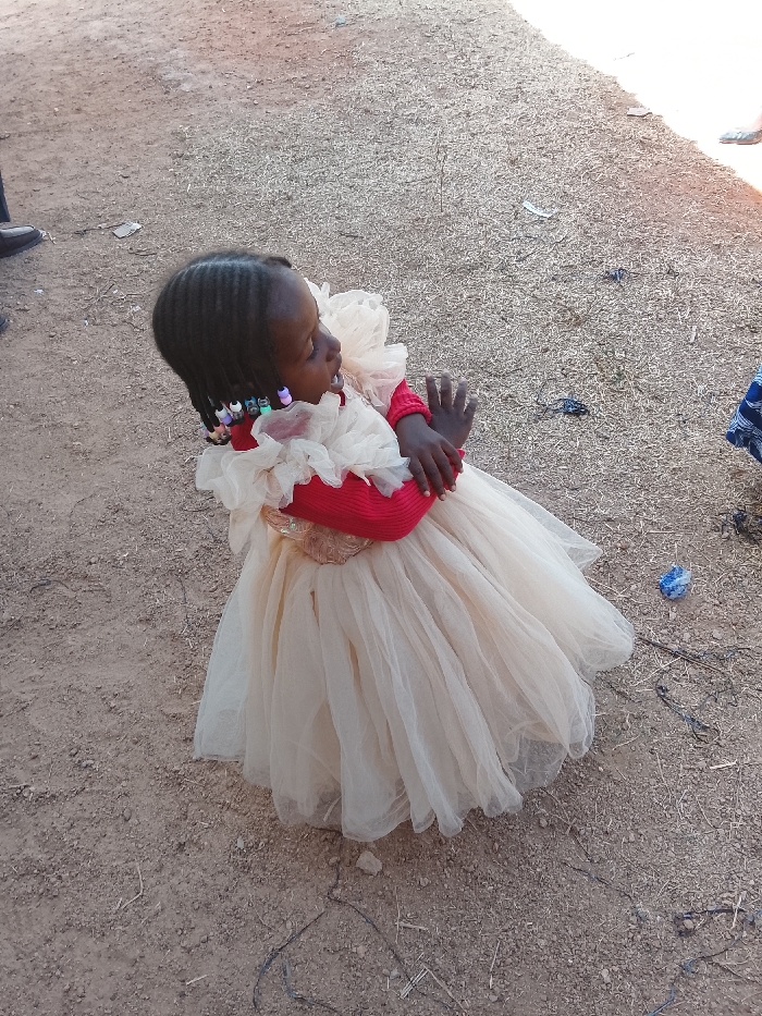 The image depicts a young Black child, positioned outdoors in Gwafan, Nigeria. The child, viewed from an elevated perspective, faces upwards and to the right, with both hands clasped together in front of her chest. Her hair is braided and adorned with multiple colorful beads, including pink, light blue, purple, and green. She is dressed in a long-sleeved red top layered beneath a voluminous, light cream or beige tulle-like dress featuring ruffles around the neckline and an ornate, possibly embroidered, band at the waist. The ground consists of dry, light brown soil mixed with fine gravel, sparse dried vegetation, and scattered debris, including small white paper or plastic fragments, dark string-like material, and a crumpled blue and white object. A dark brown shoe, belonging to an unseen individual, is partially visible on the far left of the frame, and a section of blue and white patterned fabric, indicative of another person's clothing, is visible on the far right.