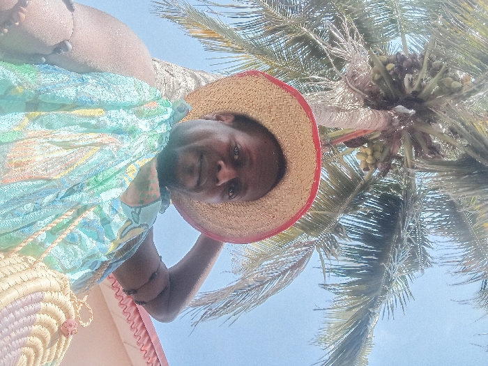 An adult male is captured in a close-up, low-angle portrait, positioned in Narayi, Nigeria. He stands directly in front of a tall palm tree laden with numerous green and brownish coconuts, which dominates the upper background against a clear blue sky. The man has a dark complexion and is looking directly at the viewer with a neutral expression. He wears a straw hat with a visible red rim. His attire consists of a loosely draped, patterned garment in shades of light blue, green, and yellow. A beaded bracelet is present on his left wrist. His right arm is bent, with his hand positioned behind his head or hat. He carries a woven straw bag with a braided strap, featuring stripes of light brown and faded purple, resting on his right side. In the lower right background, a portion of a light-colored building with a terracotta-colored, wavy-edged roofline is visible. The scene is brightly lit by natural sunlight.