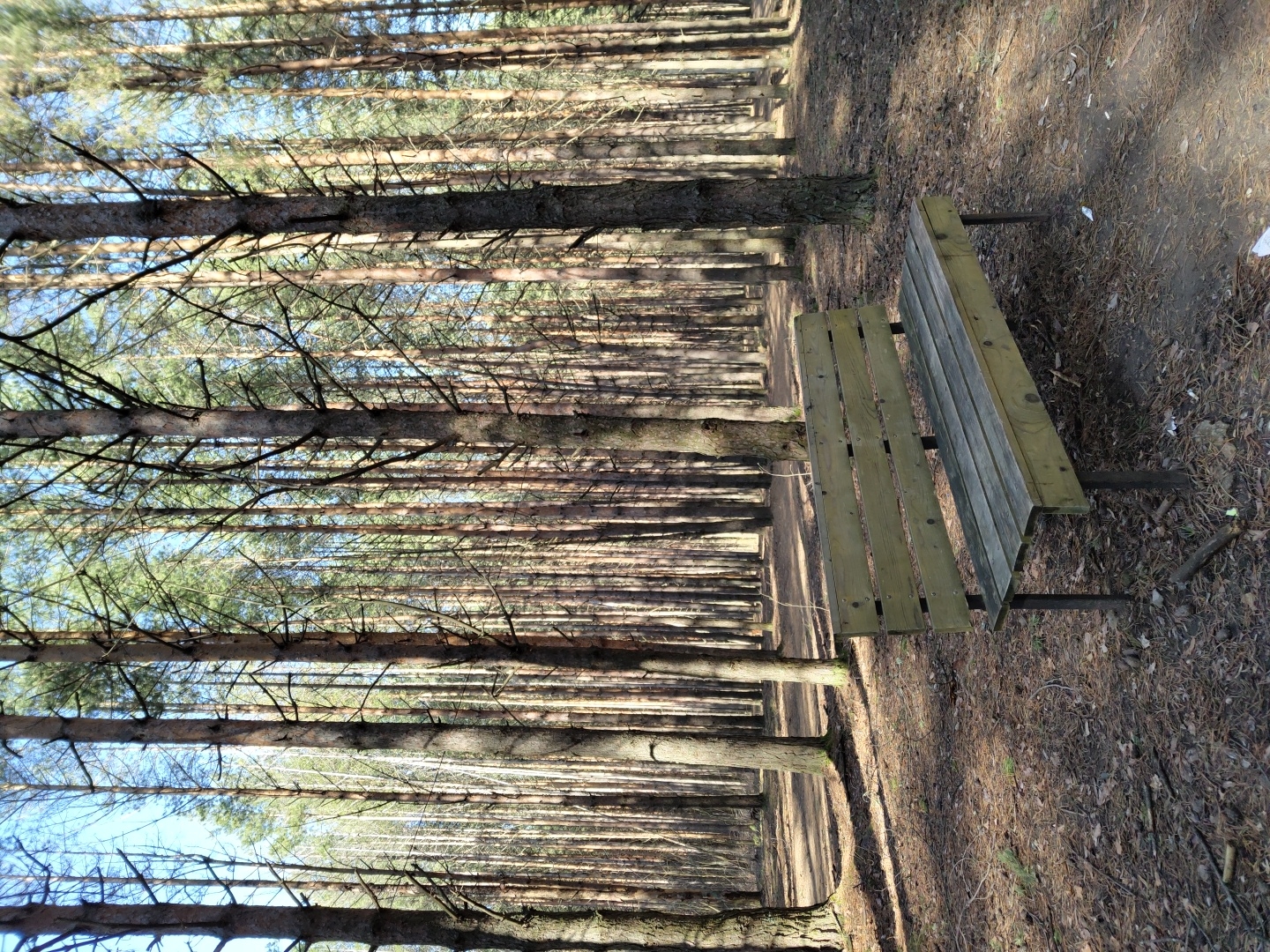 The image depicts a forest landscape with tall, thin trees oriented vertically. A wooden bench with metal legs sits on the right side of the frame, partially on dirt and fallen leaves. The trees appear to be spaced evenly, creating a pattern of light and shadow along the forest floor. The sky is visible through the tree branches at the top of the image. Based on the prompt, this image is likely located in the city of Chaikovsky, Russia.