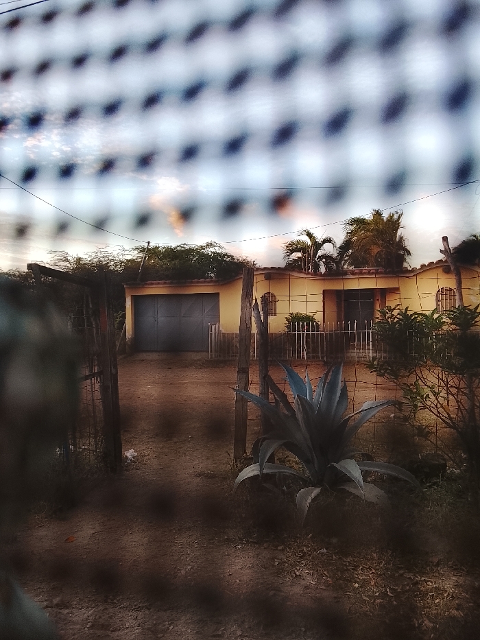 The image depicts a residential scene in Altagracia, Venezuela, captured through a blurred wire mesh fence in the immediate foreground. The time of day appears to be either sunrise or sunset, indicated by a sky showing pale blue, white, and subtle orange hues on the horizon, with a dark power line traversing horizontally across the upper mid-ground. The scene features a single-story, light yellow or cream-colored house with a reddish-brown tiled roof, positioned centrally. On the left side of the house, a dark gray or blue-gray metal garage door is visible. The house facade includes multiple arched windows with white decorative grilles and a central entrance secured by a white metal gate. In front of the house, a dirt path or driveway extends from the foreground. The immediate foreground, behind the wire mesh, consists of dry, reddish-brown earth with sparse ground cover. A prominent agave plant with blue-green leaves stands in the lower right quadrant. Two wooden posts, seemingly part of a rustic gate, mark an opening in a wire fence that borders the property. Further vegetation, including dark green bushes and several palm trees, is visible around and behind the house. No individuals or animals are present in the frame.
