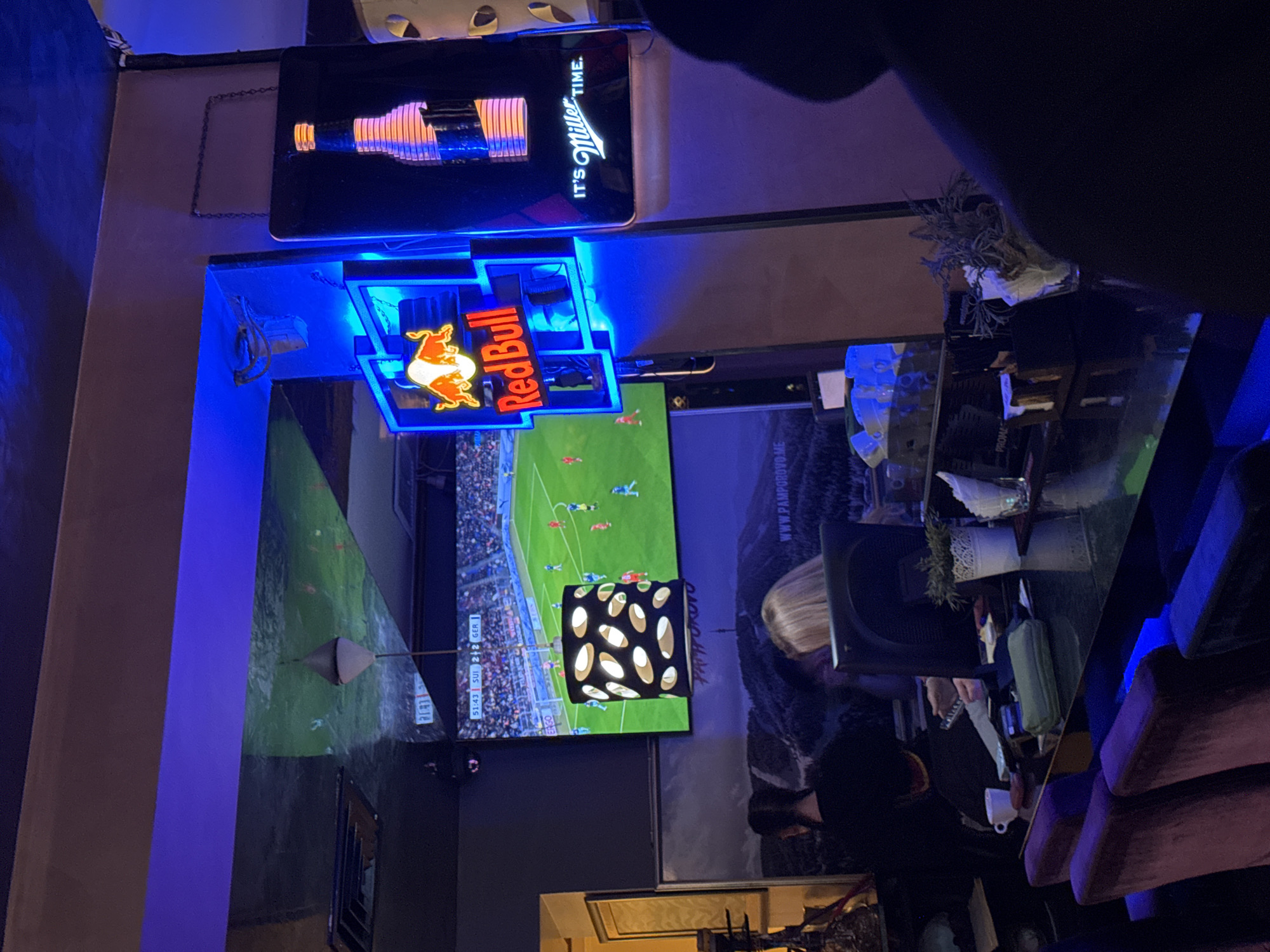 The image depicts an interior scene, possibly within a bar or restaurant in Dobrich, Bulgaria. There are illuminated advertisements for "Miller Time" and "Red Bull" mounted on the wall above a television screen displaying a soccer game between Switzerland and Germany. The game score is 2-2, with the time showing 51:43. A female bartender with blonde hair is seen working behind a bar with a reflective surface. There are various objects on the bar, including plants, bottles, and a white cup. To the left, a partial view of another television screen is visible. The bar is illuminated with blue lighting.