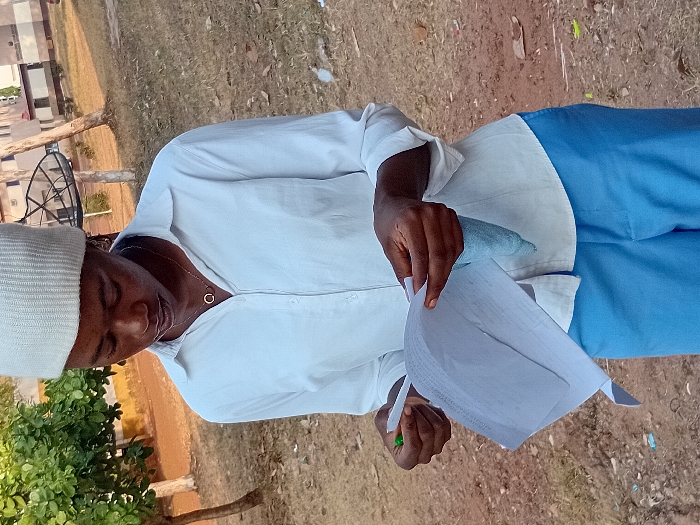 A person wears a white hat, white long-sleeved shirt, and blue pants, standing outdoors on a grassy area with some bare spots. The individual holds several white sheets of paper and a green pen, looking down at the documents. In the background, a building with a satellite dish is visible, along with a tree. The photo's orientation is rotated.