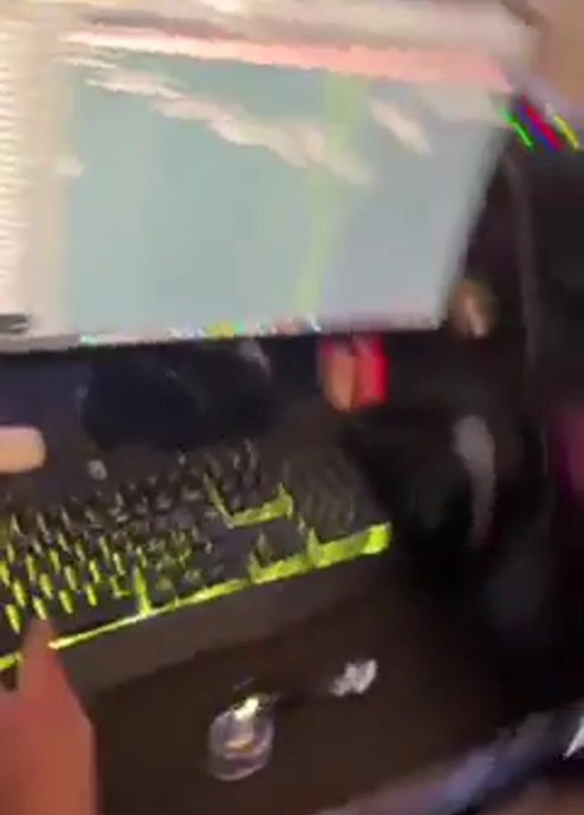 man sitting at a computer, focusing on a screen. The screen displays music editing software with a grid-like interface, suggesting music production. The keyboard has yellow lighting. He appears to be working on a music project. The room is dimly lit.