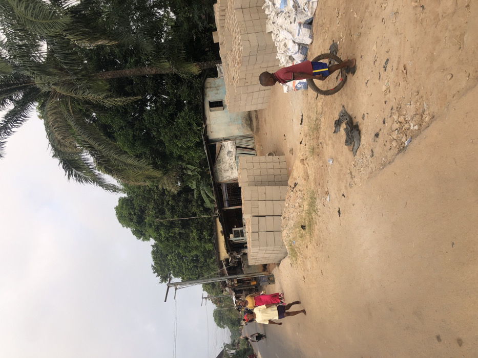 A dusty road scene features a young boy playing with a tire. He is standing on the side of the road near stacks of concrete blocks and bags. In the background, there are trees and a palm tree. A building with a tin roof and various items displayed outside is visible. Further down the road, two people are walking. The weather appears overcast.