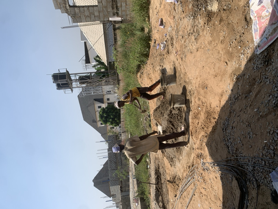 The image captures an active construction site in Abuja, Nigeria, under a clear blue sky