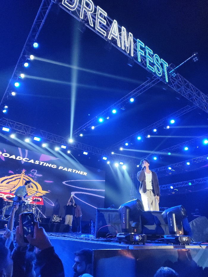 This image depicts a night-time live music performance at the "DREAM FEST" event in Islamabad, Pakistan