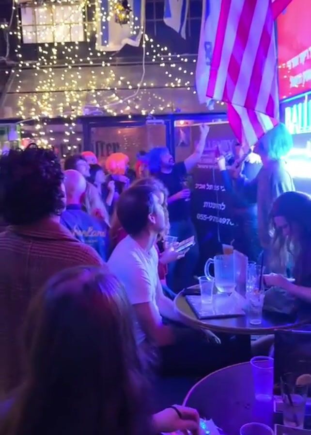 crowded bar scene. Several tables are filled with people, some sitting and some standing. A group of people in the center of the frame is singing into a microphone. Above them, the ceiling is decorated with string lights and flags, including the American and Israeli flags. A screen displays Hebrew text, which translates to "Dance the rest of the time like a stone, like a stone." Blue balloon numbers "2026" are also visible. The bar is lit with neon blue and pink lighting. The atmosphere appears lively and celebratory.