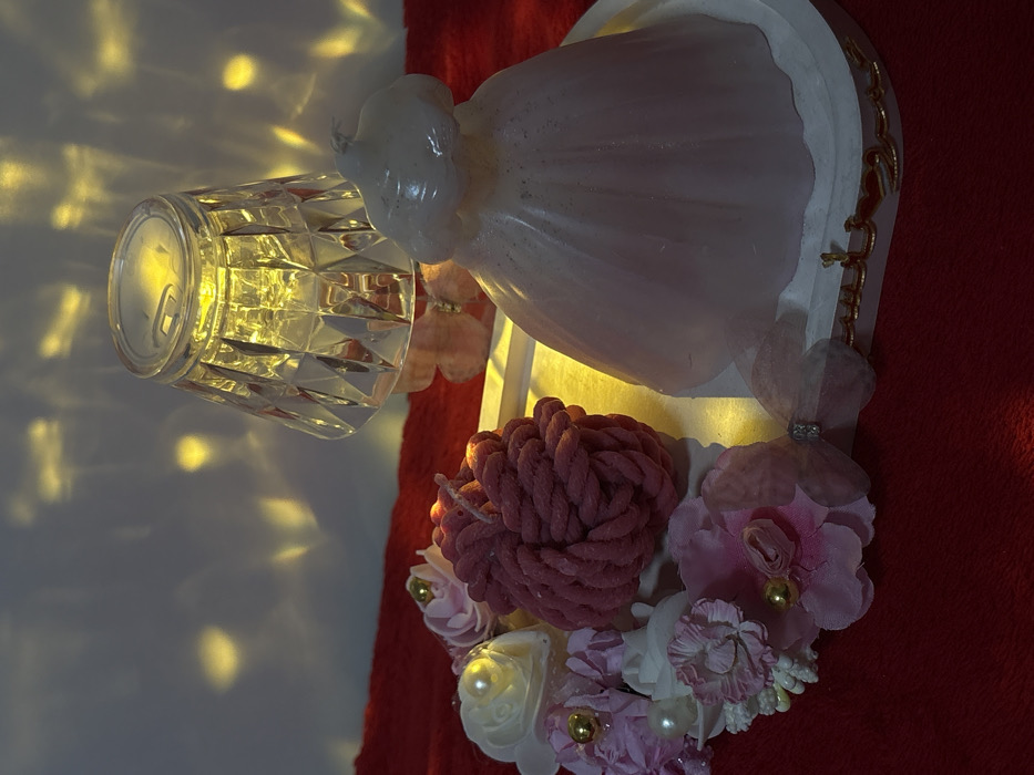 An ornate wall sconce is illuminated by a candle within a decorative glass jar. A pink-hued dress-shaped candle tops the sconce, with a decorative string of beads draping down. Below, a cluster of artificial flowers in shades of pink, white, and mauve add a whimsical touch. The sconce is mounted on a red textured surface, casting a warm glow and creating a dreamy ambiance.