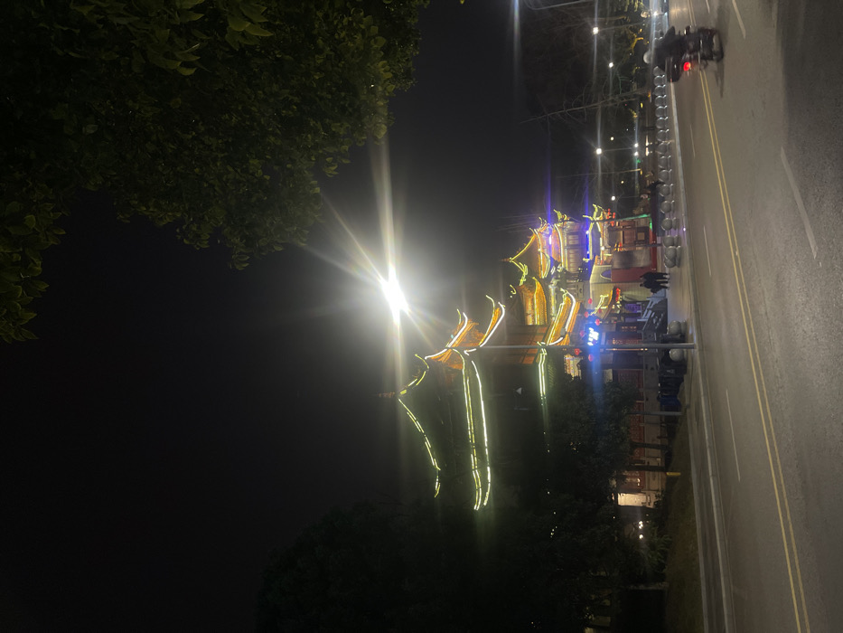 The image depicts a nighttime urban scene in Bishan, China. A multi-lane road with double yellow lines spans the lower portion of the frame, alongside a sidewalk bordered by spherical light-colored bollards. Several multi-tiered traditional Chinese-style buildings, prominently illuminated with white and yellow string lights outlining their curved rooflines and architectural details, stand on the right side of the road. Blue and red accent lighting is visible on the lower levels of these structures. A bright streetlight with a distinct starburst flare is positioned above the road, to the right of the buildings. On the sidewalk in front of the buildings, two indistinct figures are visible, while to the left of the buildings, several shared bicycles or scooters are parked. A single individual on a dark motorcycle, equipped with a top case, is in motion on the road's rightmost lane, heading from right to left. Dark trees frame the upper left and right portions of the image against a dark night sky.