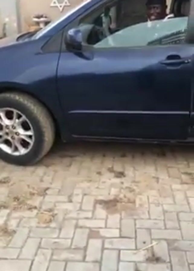 blue minivan parked on a paved driveway. A person is sitting in the driver's seat. The camera moves around the vehicle, showing its side and rear. A metal gate is visible in the background. The driveway is made of light-colored bricks with some dry grass and debris scattered around. In the background, there is a house and a basketball hoop.