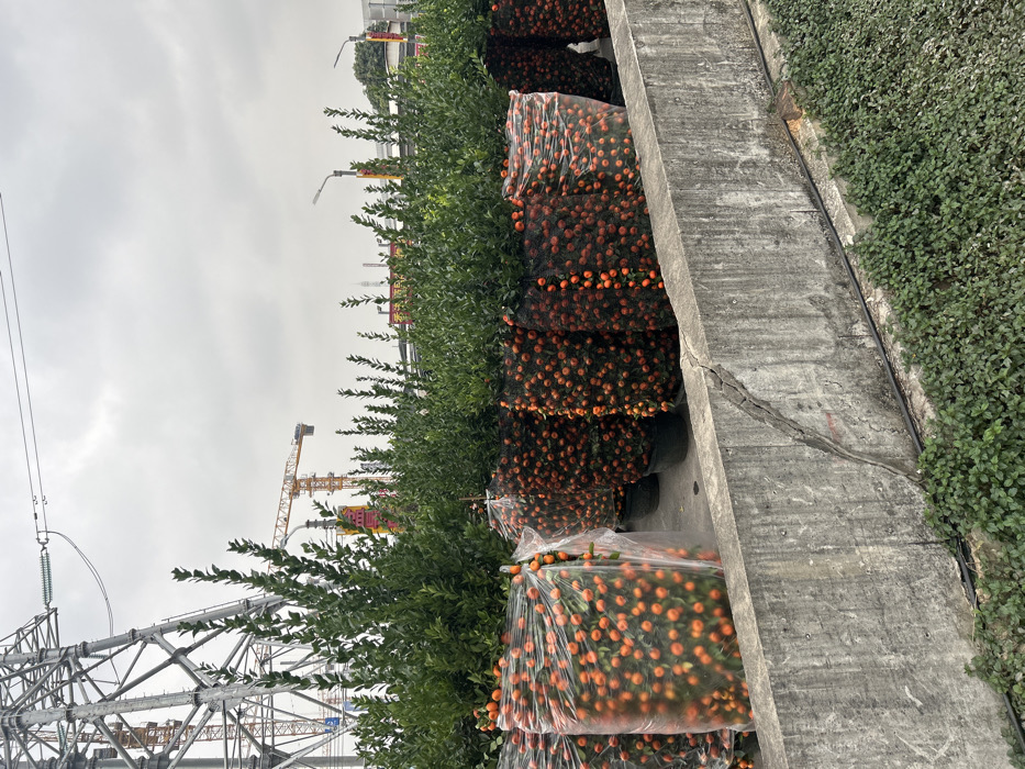The image depicts an outdoor scene in Liwan District, China, under an overcast sky. In the immediate foreground, a weathered concrete barrier exhibits a prominent diagonal crack. Below the barrier, a strip of low-lying green groundcover vegetation is present, with a black cable running along the base of the concrete. Dominating the midground is a lengthy arrangement of potted kumquat trees, densely laden with small, round, orange fruits. These trees are consistently uniform in size and foliage. Many of the potted trees are encased in black mesh netting, which contains the fruit. Others are wrapped in clear plastic sheeting, providing a transparent view of the fruit-bearing branches. The pots themselves are dark, likely black. In the background on the left, a large, grey metal lattice electricity transmission tower stands prominently, with overhead power lines extending across the upper frame. Behind this tower, a yellow tower crane is visible, indicating active construction. Further to the right in the background, another yellow tower crane is discernable, along with several streetlights, sparse green trees, and indistinct urban structures. No people are visible in the scene.