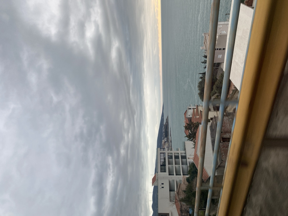The image presents an elevated coastal panorama of Dobra Voda, Montenegro, observed under a heavily overcast sky. The upper two-thirds of the frame are dominated by a dense, uniform layer of gray stratocumulus clouds. A faint, diffuse band of lighter, potentially yellowish-orange light is visible on the far right horizon, suggesting low sun or twilight conditions. The central and right portions of the midground are occupied by a body of water, consistent with the Adriatic Sea, exhibiting a teal to deep blue hue with visible ripples on its surface, indicating slight choppiness. The horizon line is clearly defined across the expanse of water. Along the left and central midground, a series of structures are built on the sloping terrain. A prominent multi-story, modern building, primarily white with dark-framed windows and multiple recessed balconies, is situated on the upper-left slope. Below it and extending towards the center, several smaller residential buildings with distinct red-tiled roofs are visible. Sparse green vegetation, including trees and shrubs, is interspersed between and around these structures. In the distant background, to the left, dark green hills or mountains rise, with faint vertical structures resembling wind turbines discernible on their peaks. Further along the coastline to the far left, additional buildings form a distant settlement. The immediate foreground features a blurred, multi-bar guardrail-like structure running horizontally across the bottom fifth of the image. This structure consists of a thick, yellow-gold colored upper rail and two thinner, blue-grey rails below it, indicating the vantage point is from an elevated road or platform. No individuals or discernible actions are present within the frame.
