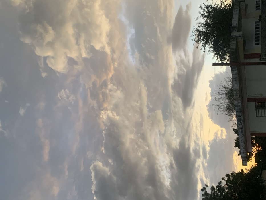 Dramatic clouds fill the sky, varying in gray and white hues with hints of golden sunlight peeking through. To the right, the corner of a building is visible, with dark green foliage interspersed around it. A pole extends vertically up from the building's edge. The overall composition is vertically oriented.