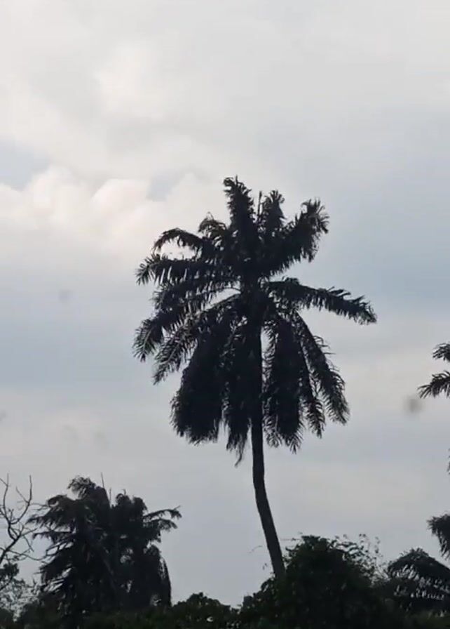 palm tree silhouetted against a cloudy sky. There are other trees in the background, and the video is shot from a low angle looking up. Rain seems to be falling.