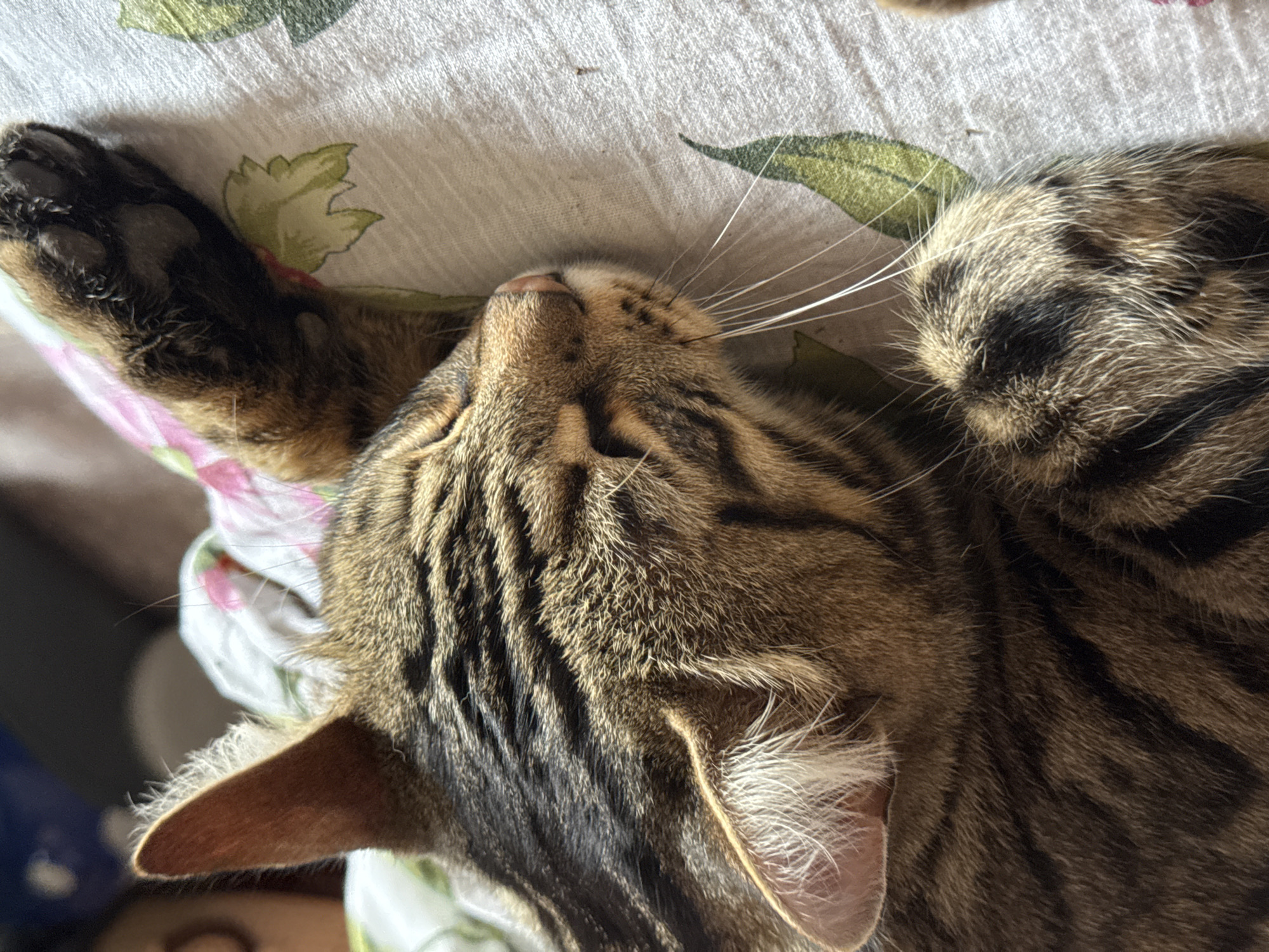 - "A brown tabby cat is sleeping on a white and green floral patterned surface" by FM-UHaA33, licensed under CC BY 4.0
