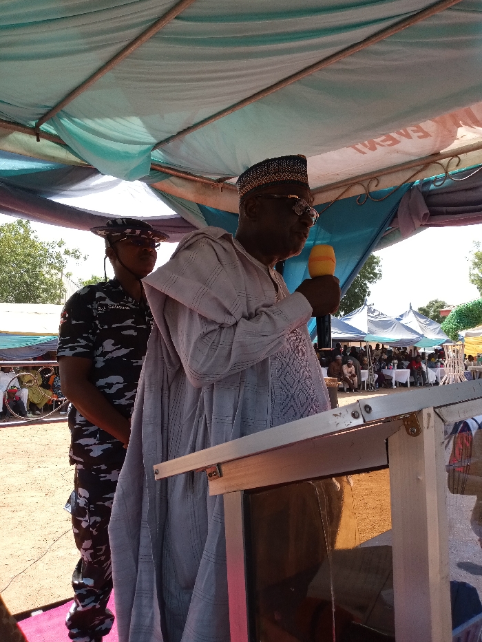 n older man wearing a grey robe and a hat, standing behind a wooden podium and speaking into a yellow microphone. He is wearing glasses. A younger man in camouflage fatigues is standing behind him, to the left. The scene takes place under a tent canopy with a blue and white patterned fabric. In the background, there are more people gathered under tents, as well as trees and a sandy ground. The location, determined from the given coordinates, is in the city of Zum, Nigeria.