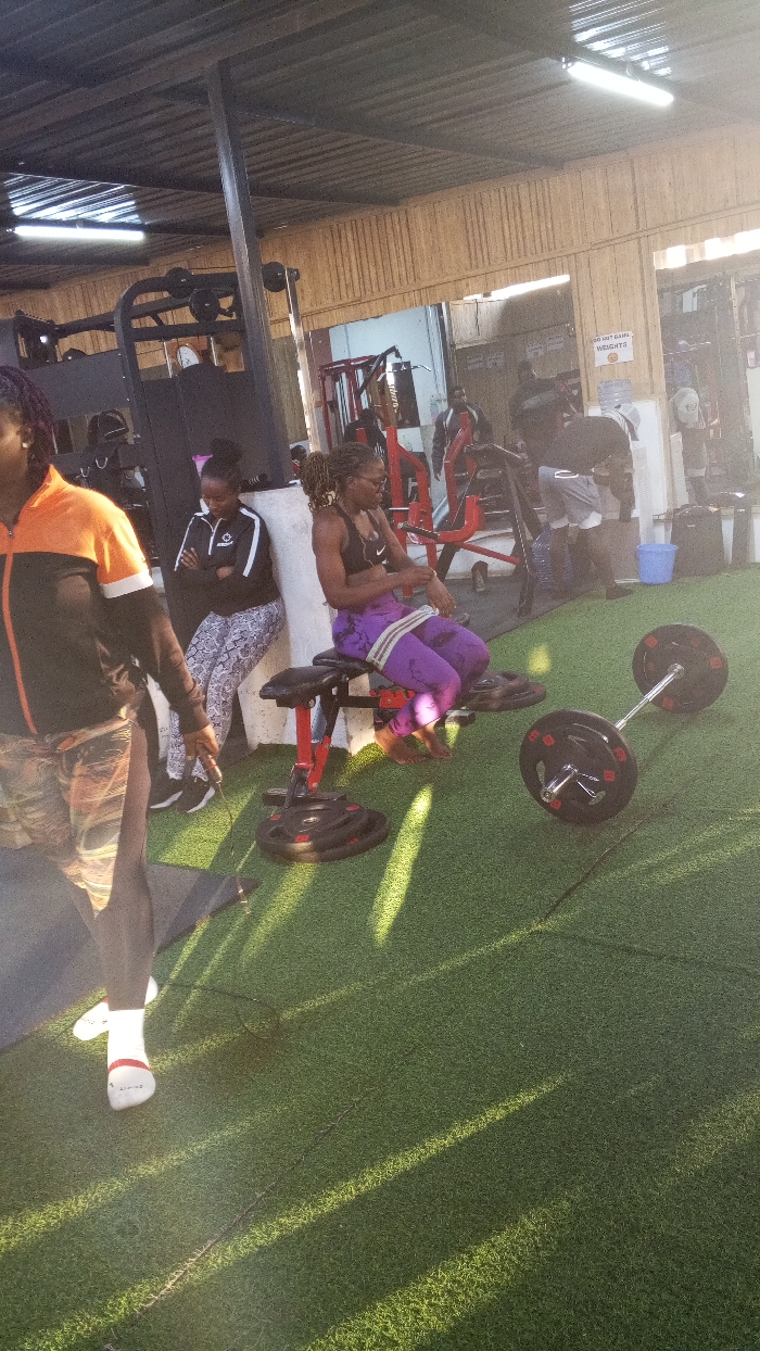 An indoor gym features multiple people, weights, and equipment. In the foreground, a woman in exercise attire walks past a seated woman who is wearing purple pants and seated on a red weight bench that is beside a barbell. In the background, other gym-goers are working out. The gym has artificial turf and a mirrored wall. Overhead lighting is visible.
