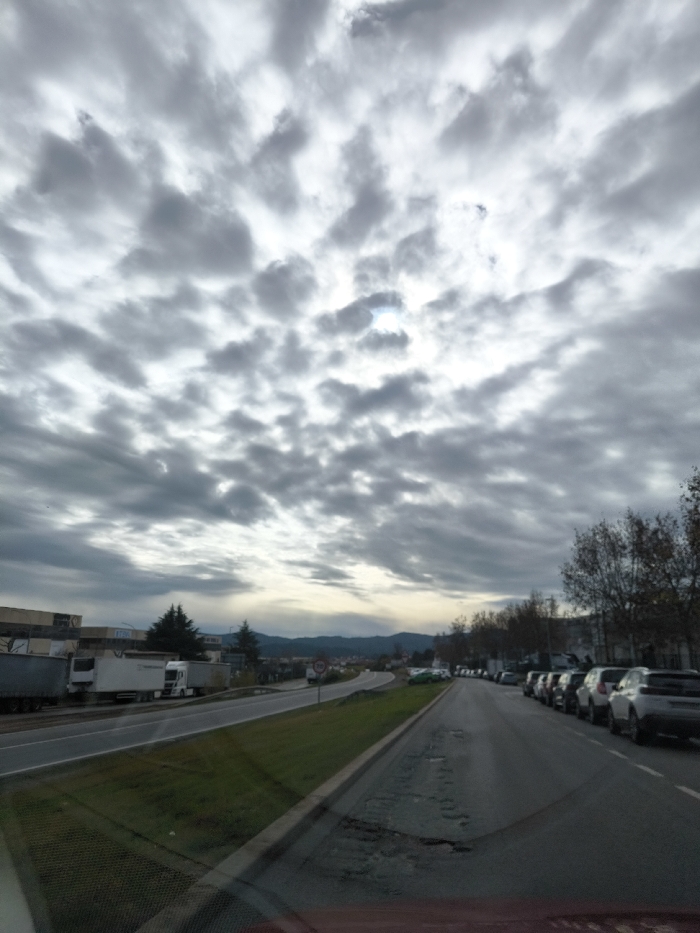The image captures an outdoor scene in Barberà del Vallès, Spain, under a sky largely covered by dense, grey altocumulus clouds, with a singular bright spot indicating a partially obscured sun near the top center