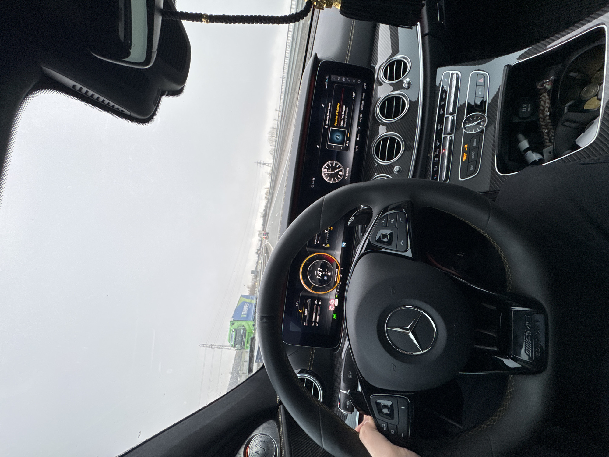 The image depicts the interior of a Mercedes-Benz AMG vehicle, observed from the driver's perspective, traveling on a multi-lane highway in the vicinity of Malo Buchino, Bulgaria, under an overcast sky. A driver's left hand is visible gripping the black leather steering wheel, which features yellow stitching and the Mercedes-Benz and AMG logos. The digital instrument cluster displays a speed of 141 km/h, an ambient temperature of 4.0°C, engine oil temperature at 90°C, transmission fluid temperature at 52°C, and the time 16:58. The adjacent infotainment screen shows Spotify playing "Powache Ot Vuichko" by Krisko, Lara Karagane, with an interior temperature of 23°C and the date 27.03.2024. The dashboard and center console exhibit carbon fiber trim, housing air vents and various control buttons for climate, navigation, radio, and media. An open storage compartment below the central controls contains coins, a braided cord, and other miscellaneous items. A black and gold beaded tassel hangs from the rearview mirror assembly. Outside the vehicle, a green semi-truck with "TRANSPRES" emblazoned on its trailer is visible in the adjacent left lane. An electricity pylon stands on the roadside, with distant hills and other vehicles faintly visible on the highway.